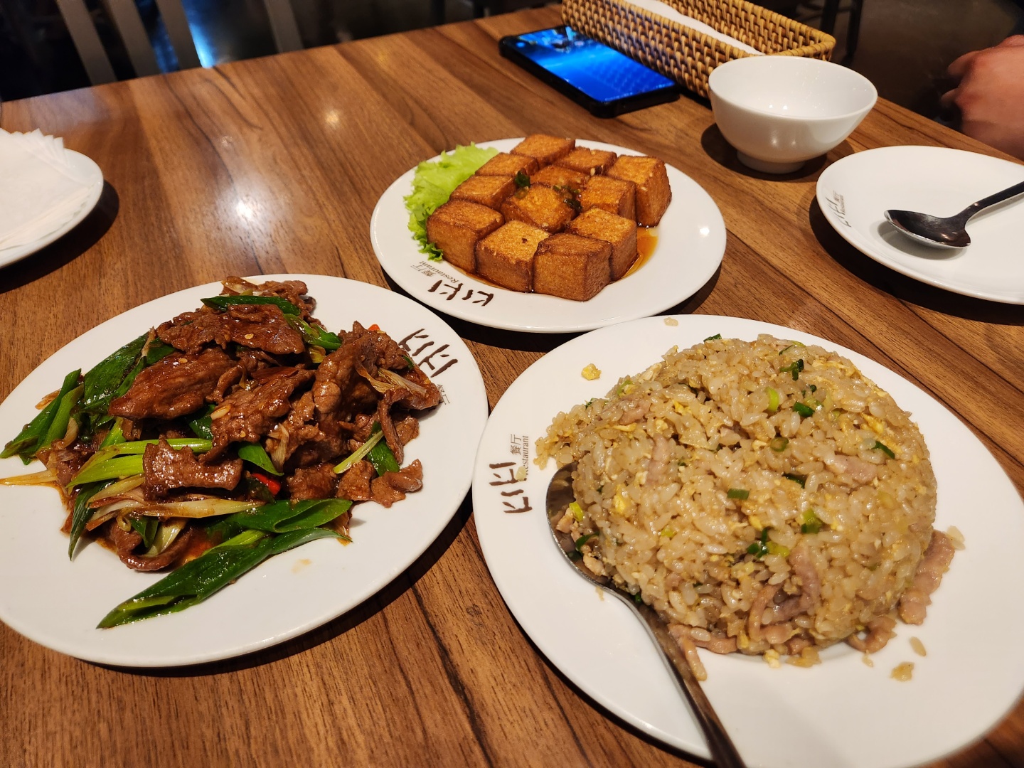 가장 유명한 두부 튀김, 소고기 볶음, 계란새우볶음밥, 비빔면을 주문했습니다.